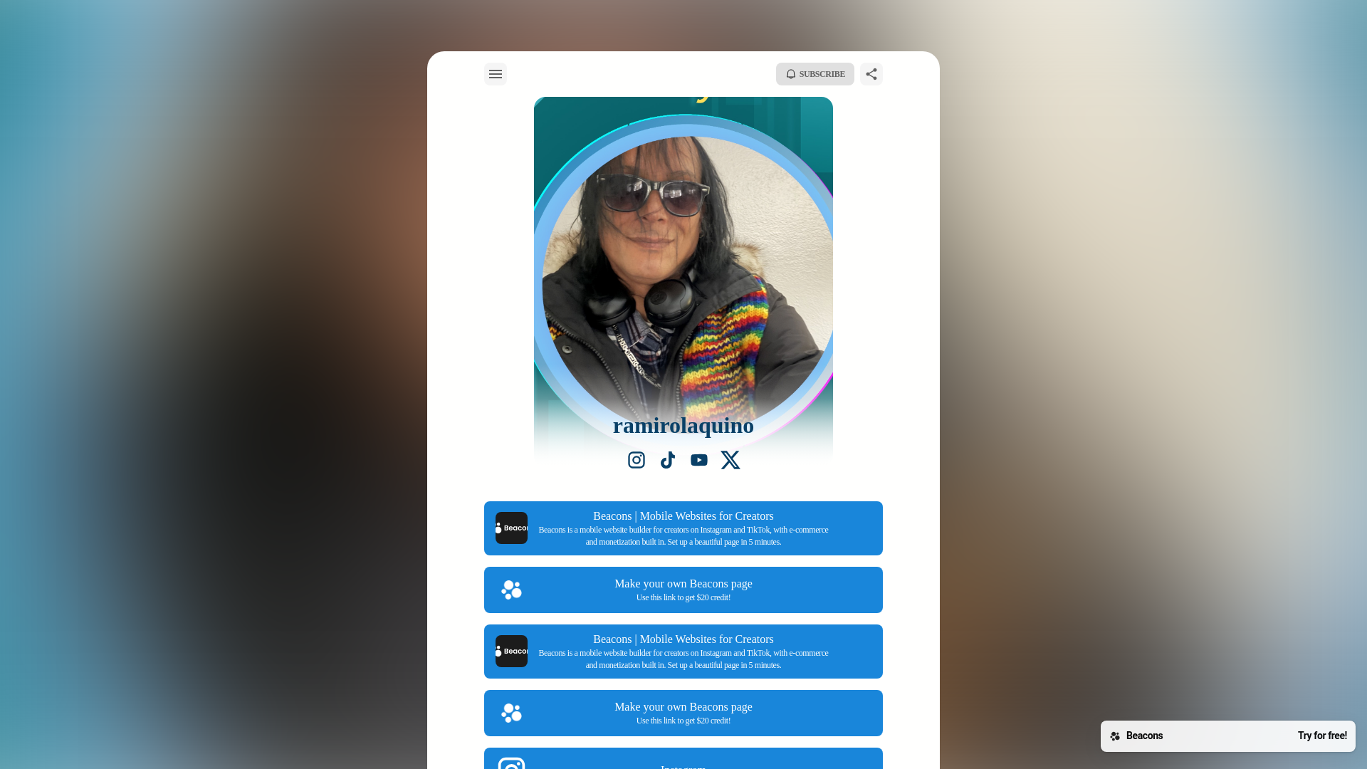 | https://beacons.ai/signup?referral_type=sticky_footer&referring_user=ramirolaquino&utm_source=bUnknown&utm_medium=self_referral&utm_campaign=ramirolaquino&utm_content=linkinbio_sticky_footer | BeaconsTry for free! |